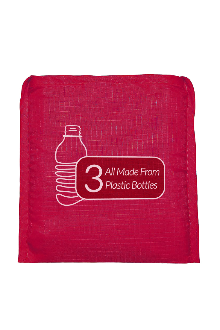 This versatile and functional bag is ideal for shopping or travel. The 100% post-consumer recycled bottle fabric exterior upcycles up to 10 local plastic bottles. Easy to clean, the bag can compress flat or folded to form a mini wallet compactly when not in use.